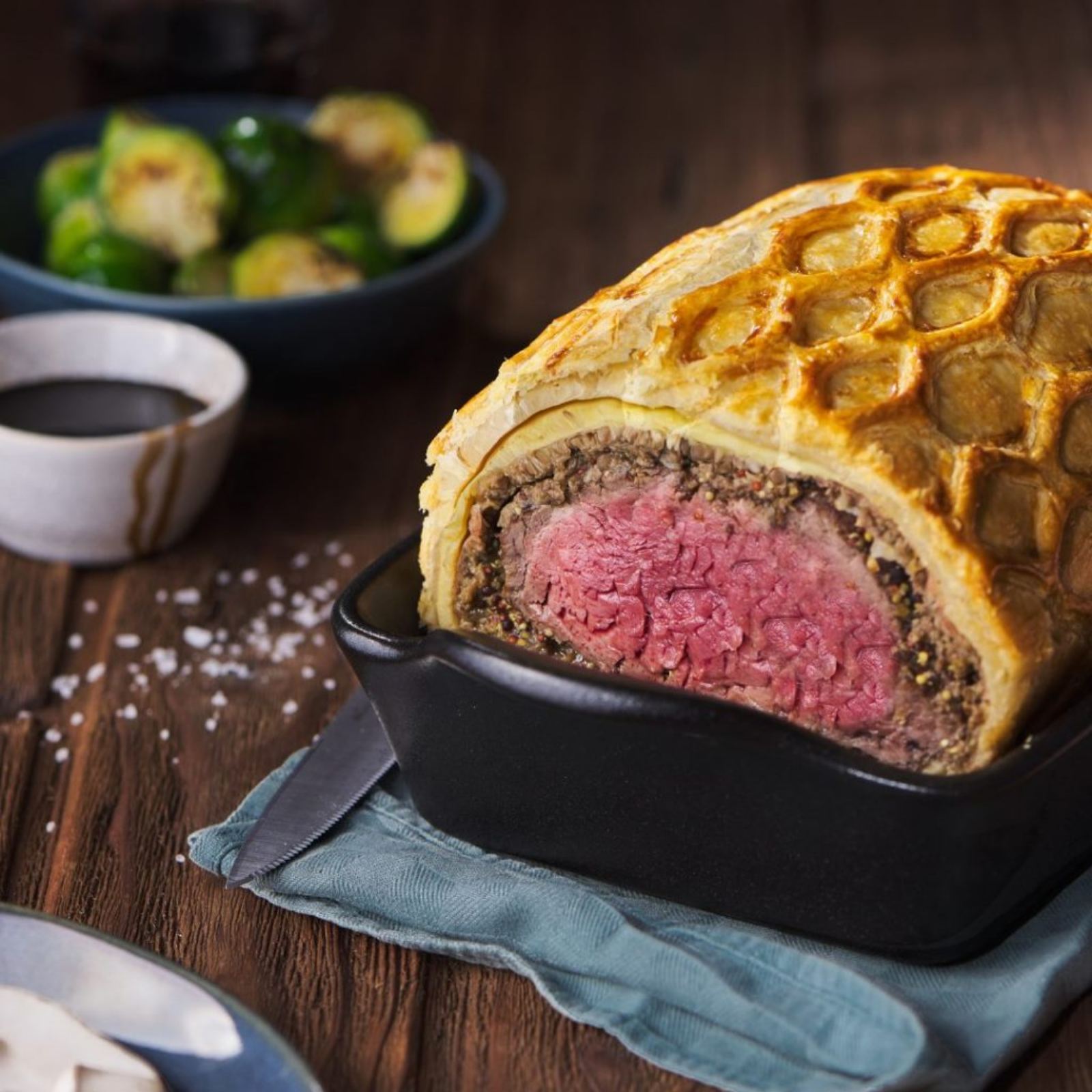 Ολόκληρο φιλέτο μοσχαρίσιο σκοράρισμενο και τυλιγμένο με μανιτάρια σαμπινιον μουστάρδα Dijon και γαλλική σφολιάτα βουτύρου