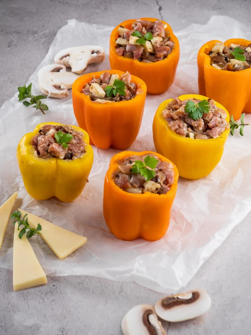 Πιπεριές χρωματιστές γεμισμένες με ψιλοκομμένο φιλέτο μπούτι γραβιέρα και μαρινάδα που περιέχει τριμμένο μανιτάρι πορτσίνι ψήσιμο για το φούρνο.